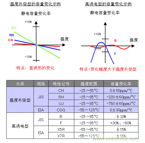 陶瓷電容器如圖2所示,可分為溫度補(bǔ)償型與高誘電型。由于各種溫度條件下的靜電容量變化情況各不相同,因此需要根據(jù)電容的特點(diǎn)來(lái)確定其用途。日本國(guó)內(nèi)所采用的JIS規(guī)格、歐洲所采用的EIA規(guī)格均做出了詳細(xì)的分類
