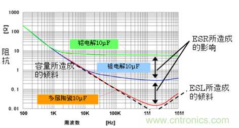 多層陶瓷電容器具有良好的高頻特性。與其他電容器相比,由于其具備能夠減小電阻及殘余電感的構(gòu)造,因此在高頻條件下也能保證 電容器的工作。圖3、圖4所示為等效電路與電感的特性。由于鋁電解電容器及鉭電解電容器的ESR較高,因此阻抗也就較高。但陶瓷電容器卻是頻率越高則阻抗 越低,這對(duì)于去藕來(lái)說(shuō)非常有效,并能夠發(fā)揮高性能的濾波能力。