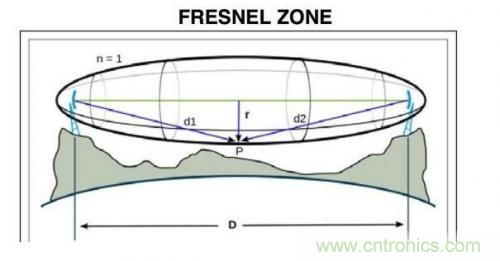 菲涅爾區(qū)是指無線電波離開天線后在可視距離周圍傳播的區(qū)域,如圖2所示。擁有視距對于保持強度有利,對于2.4GHz無線系統(tǒng)更是如此,原因在 于2.4GHz波易被水吸收。根據(jù)經(jīng)驗,必須有60%的菲涅爾區(qū)不存在障礙物。通常,20%的菲涅爾區(qū)被阻擋時幾乎不會引起鏈路信號損耗,而這一比例超過 40%時信號損耗將非常明顯。