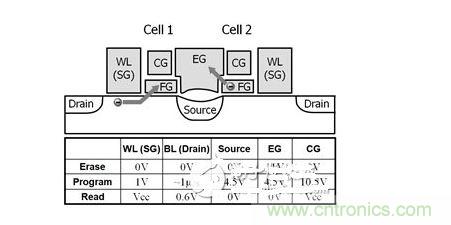 1 第3代SuperFlash存儲單元的結構和典型工作條件。圖中給出了兩個共用源極和擦除柵極的單元。圖中用箭頭指示燒寫(單元1)和擦除(單元2)期間的電子轉移情況。WL為字線(選擇柵極),CG為耦合柵極,EG為擦除柵極,F(xiàn)G為浮置柵極。