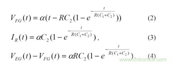 圖5顯示了SuperFlash單元的簡化R-C圖及其等效電路。其中,C1為EG-FG電容,C2為總FG電容與CFG-EG的差值,R為有效隧穿電阻。VEG線性斜坡(VEG=αt)和歐姆電阻R組成的等效電路中的瞬變具有簡單的閉環(huán)解決方案: