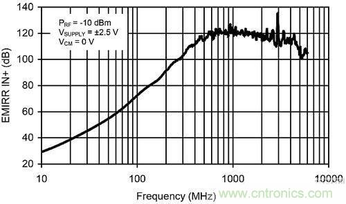 考慮到所有這些因素,電路板和系統(tǒng)級設(shè)計人員應(yīng)如何選擇放大器呢?答案是:要看電磁干擾抑制比(EMIRR)。該技術(shù)指標(biāo)類似于電源抑制比和共模抑制比,因為它在放大器的輸入端將RF干擾的影響轉(zhuǎn)換成DC偏移電壓。作為一個例子,圖1展示了OPA333的EMIRR曲線。從曲線可注意到,當(dāng)頻率為1000MHz時該運(yùn)放具有120dB的EMIRR。這是非常高的抑制水平,使得直接把該曲線與其它器件的曲線進(jìn)行比較成為可能。