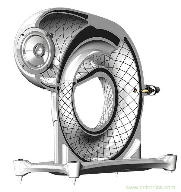為了不必使用聲波吸收就能夠解決這個問題,畢業(yè)于以色列Bezalel藝術(shù)與設(shè)計學(xué)院的工業(yè)設(shè)計師Boaz Dekel提出了一個非常獨特的解決方案:去掉音箱的后壁。簡單地說,Dekel構(gòu)思了一個圓形音箱Aleph1。在這個音箱里,向后的聲音會進(jìn)入“一個永久的自送(self-feeding)回路,以防止它被直接反彈回去,干擾到向前輸出的聲音信號。”Dekel解釋說。