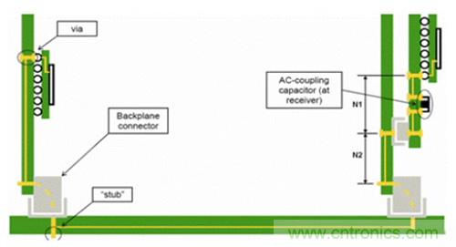 下圖所示是一個典型的高速信號互連鏈路,信號傳輸路徑包括:①發(fā)送端芯片(封裝與PCB過孔)②子卡PCB走線③子卡連接器④背板PCB走線⑤對側子卡連接器⑥對側子卡PCB走線⑦AC耦合電容⑧接收端芯片(封裝與PCB過孔)