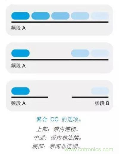 載波聚合有帶內(nèi)的載波聚合,帶內(nèi)又分成連續(xù)和非連續(xù),連續(xù)的是這兩個載波是緊靠在一塊的,非連續(xù)的是中間有隔斷,并不是連續(xù)的載波。帶間的載波聚合是指兩個不同頻段的載波,這得根據(jù)不同運營商所應(yīng)用的頻譜來采用不同的載波聚合的方式,對射頻前端的設(shè)計要求差異也很大。