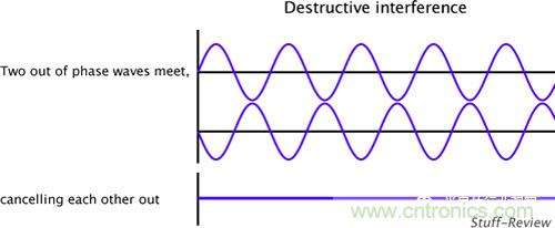ANC技術(shù)的原理并不深奧,高中物理就教過,就是波的干涉。如果大家對高考復(fù)習(xí)還記憶猶新的話,一定還記得如果兩列波幅度相同,相位相反,則它們干涉的結(jié)果是互相抵消,看不到波了!