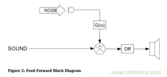 如果把系統(tǒng)畫成信號流圖,就是下圖,噪聲在麥克風(fēng)采樣后進(jìn)入信號處理電路,產(chǎn)生“反”噪聲,并與音樂一起送進(jìn)耳機(jī)內(nèi)。這種模式稱為前饋有源噪聲消除。