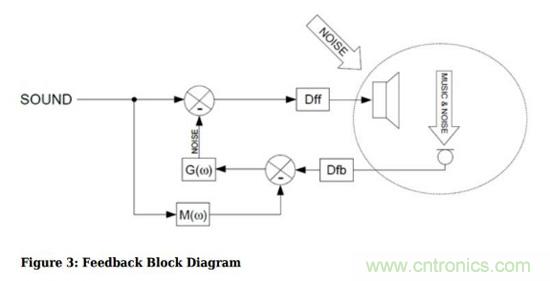 在反饋有源噪聲消除方案中,麥克風(fēng)采樣的不是直接的環(huán)境噪聲,而是耳機(jī)輸出處的聲音,顯然這里的聲音包括了音樂和環(huán)境噪聲。那么如何選擇性地抵消掉噪聲但是保留音樂呢?就需要把這里采樣到的聲音減去音樂,這樣剩下的信號就全是噪聲了;然后再根據(jù)這個(gè)噪聲去產(chǎn)生噪聲抵消信號。這樣做的話,就不會有風(fēng)噪問題。然而,這里又有一個(gè)新問題,就是反饋系統(tǒng)通常帶寬會遠(yuǎn)小于前饋系統(tǒng),因此使用反饋模式的有源噪聲消除對于高頻噪聲的抵消作用有限。