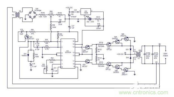 電阻R2和電容C1套集成電路內(nèi)部振蕩器的頻率。預(yù)設(shè)R1可用于振蕩器的頻率進行微調(diào)。14腳和11腳IC內(nèi)部驅(qū)動晶體管的發(fā)射極終端。的驅(qū)動晶體管(引腳13和12)的集電極終端連接在一起,并連接到8 V軌(7808輸出)??稍贗C的引腳14和15兩個180度,淘汰50赫茲脈沖列車。