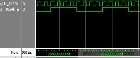 根據所需的時鐘頻率為1024kHz的時鐘,而晶振時鐘的頻率為8192kHz,晶振時鐘與所需的時鐘頻率恰巧是8倍的整數倍關系,因此需要對8192kHz的晶振時鐘進行8分頻來獲得所需要的時鐘。根據整數倍分頻器的設計方法原理,通過ISE9.1邏輯設計工具,利用VHDL硬件描述語言來進行8分頻的分頻器設計。然而8又是偶數,所以需要設計的是偶數分頻器。對設計的內容通過Modelsim6.5仿真軟件進行仿真驗證,結果如圖3-1所示。