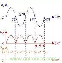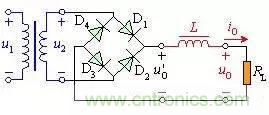 在橋式整流電路中,當(dāng)u2正半周時(shí),D1、D3導(dǎo)電,電感中的電流將滯后u2不到90°。當(dāng)u2超過(guò)90°后開(kāi)始下降,電感上的反電勢(shì)有助于D1、D3繼續(xù)導(dǎo)電。當(dāng)u2處于負(fù)半周時(shí),D2、D4導(dǎo)電,變壓器副邊電壓全部加到D1、D3兩端,致使D1、D3反偏而截止,此時(shí),電感中的電流將經(jīng)由D2、D4提供。由于橋式電路的對(duì)稱性和電感中電流的連續(xù)性,四個(gè)二極管D1、D3;D2、D4的導(dǎo)電角θ都是180°,這一點(diǎn)與電容濾波電路不同。