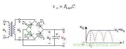 式中包括變壓器副邊繞組的直流電阻和二極管的正向?qū)娮?。由于一般很小,電容器很快就充到交流電壓u2的最大值,如波形圖2(b)的時(shí)刻。此后,u2開(kāi)始 下降,由于電路輸出端沒(méi)接負(fù)載,電容器沒(méi)有放電回路,所以電容電壓值uC不變,此時(shí),uC>u2,二極管兩端承受反向電壓