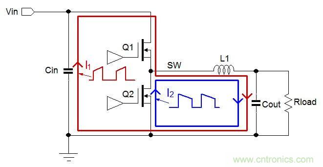 在上面所述的回路中,電流環(huán)I1和I2共同共享了自開(kāi)關(guān)節(jié)點(diǎn)→電感→輸出電容→地→Q2的源極這一段路徑。I1和I2合成起來(lái)后就形成了一個(gè)相對(duì)平緩、連續(xù)的鋸齒狀波形,由于其中不存在電流變化率dI/dt極高的邊沿,其包含的高頻成分就要少一些。