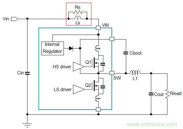 在理想狀況下,輸入、輸出電容對(duì)于Buck轉(zhuǎn)換器的開(kāi)關(guān)電流來(lái)說(shuō)都具有極低的阻抗。但在實(shí)際上,電容都存在ESR和ESL,它們都增加了電容的阻抗,并且導(dǎo)致上面出現(xiàn)額外的高頻電壓跌落。這種電壓跌落將在電源供應(yīng)線(xiàn)路上和負(fù)載連接電路上形成相應(yīng)的電流變化,見(jiàn)圖4。