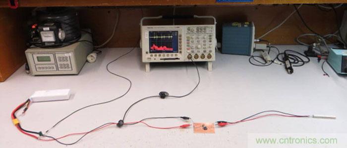 輸入線(xiàn)靠電池一側(cè)的接地端通過(guò)一只100Ω的電阻和實(shí)驗(yàn)臺(tái)的地連接在一起,這就給整個(gè)電路提供了一個(gè)參考地,其阻抗很像EMC測(cè)試中的LISN網(wǎng)絡(luò)。