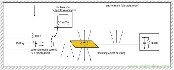 當(dāng)被測(cè)試對(duì)象被放在實(shí)驗(yàn)桌上時(shí),其PCB上的電流回路和導(dǎo)線(xiàn)就會(huì)向周?chē)h(huán)境輻射出高頻能量,這些輻射信號(hào)又會(huì)自己找到路徑返回到測(cè)試對(duì)象上,并以高頻共模電流的形式出現(xiàn)在供電線(xiàn)上。這些供電線(xiàn)上的高頻共模電流會(huì)和板上的電流結(jié)合在一起,可被用著輻射狀況的指示信號(hào)。