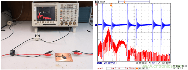 這種環(huán)形天線(xiàn)可以被連接到頻譜分析儀上,當(dāng)你使它在PCB上方移動(dòng)時(shí),你就可以看到哪里會(huì)有比較強(qiáng)的高頻磁場(chǎng)。你也可以把它連接到一臺(tái)示波器上(使用50Ω的端子),示波器上就可以顯示出相應(yīng)區(qū)域的切換噪聲水平。保持天線(xiàn)環(huán)和板子之間的相對(duì)位置和距離不變,對(duì)電路、PCB上的回路做出某些改變,你就可以知道噪聲水平在增加或是減少。