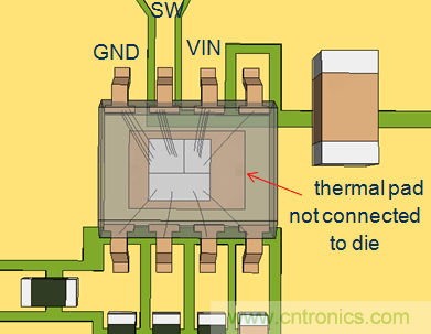 在RT7297CHZSP中,芯片底部的散熱焊盤(pán)是沒(méi)有和晶圓內(nèi)核連接在一起的,所以在PCB布局中將銅箔和散熱焊盤(pán)連接在一起并不能縮短CIN回路。它的上橋MOSFET和下橋MOSFET通過(guò)多根邦定線(xiàn)連接到VIN和GND端子,因而可以通過(guò)這兩個(gè)端子形成最短的回路。