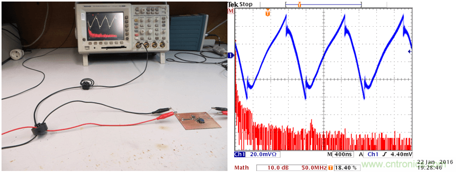 自制的EMI電流測(cè)試工具(見(jiàn)第8章)可被安置在電源輸入線(xiàn)和輸出線(xiàn)上。在本文中,我們是用示波器來(lái)觀看測(cè)量到的高頻電流信號(hào),它能顯示出轉(zhuǎn)換器開(kāi)關(guān)切換期間的高頻小信號(hào)。對(duì)于這種重復(fù)出現(xiàn)的開(kāi)關(guān)切換信號(hào)而言,使用示波器的FFT功能進(jìn)行計(jì)算并看到測(cè)量電流中的各種頻率成分是可能的。這種方法雖然不如頻譜分析儀那么精確,但仍然不失為一種非常實(shí)用的工具,可在簡(jiǎn)單電路的分析中提供判斷依據(jù)。