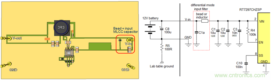 我們繼續(xù)使用單面PCB,并將CIN放置到靠近IC的地方,這樣就形成了比較小的CIN回路。參見(jiàn)圖20。
