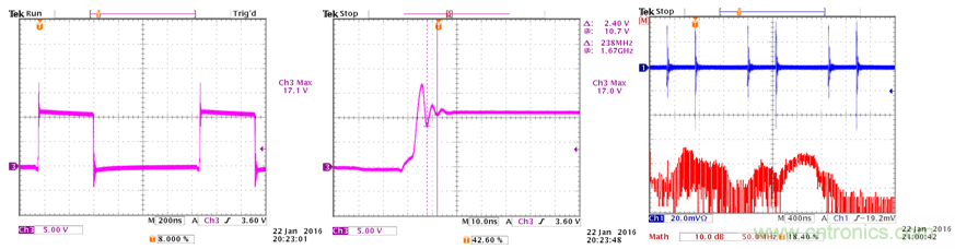 開(kāi)關(guān)切換波形顯示出5V的過(guò)沖,過(guò)沖信號(hào)的振蕩頻率為238MHz;輸入線(xiàn)上的共模電流顯示出明顯的高頻噪聲。參考圖33。