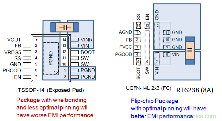 圖22顯示出了電容的放置方法,現(xiàn)在的CIN回路就通過(guò)IC的引腳、內(nèi)部的邦定線(xiàn)和0603規(guī)格的電容形成了。