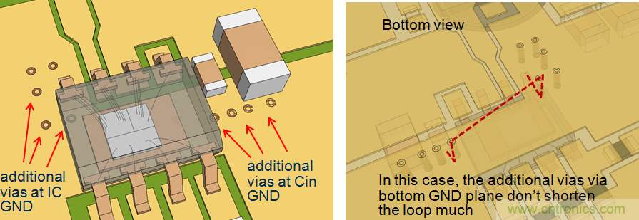 在上面的例子中,通到地線(xiàn)層的附加導(dǎo)通孔對(duì)縮減CIN回路的長(zhǎng)度沒(méi)有幫助。但在另一個(gè)例子中,由于頂層的路徑很長(zhǎng),通過(guò)導(dǎo)通孔來(lái)縮小回路面積就十分有效。
