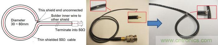 其實(shí)我們是有可能在實(shí)驗(yàn)室環(huán)境下對(duì)產(chǎn)品原型進(jìn)行一些基本的EMI測(cè)試的,還可對(duì)系統(tǒng)的各個(gè)模塊分別進(jìn)行。這樣的測(cè)試通常屬于近場(chǎng)環(huán)境(測(cè)量距離 < 0.16λ),因而在測(cè)試電流回路的輻射狀況時(shí)需要使用小型的環(huán)形天線(xiàn)來(lái)對(duì)高頻磁場(chǎng)進(jìn)行測(cè)量。你可以使用一段50Ω的同軸電纜自己制作小型的擁有電屏蔽的環(huán)形天線(xiàn),這看起來(lái)并不是一件很難的事情,可參考圖43的示意進(jìn)行。