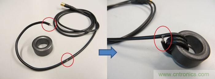 現(xiàn)在將電纜穿過(guò)鐵芯就可以對(duì)其中的高頻電流進(jìn)行測(cè)量了,電流變壓器的輸出可以接入頻譜儀或是示波器(使用50Ω端口)。