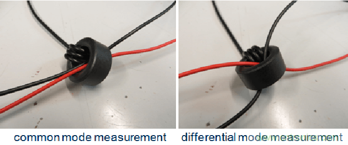 將電源線(xiàn)的正、負(fù)兩條線(xiàn)以同一個(gè)方向穿過(guò)鐵芯可測(cè)量其中的共模電流,顛倒其中一條線(xiàn)的方向則可測(cè)量差模電流。參見(jiàn)圖45。