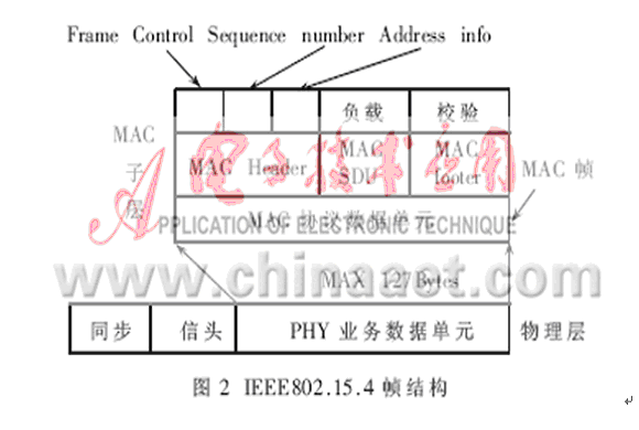 IEEE802.15.4的MAC協(xié)議包括以下功能:設備間無線鏈路的建立、維護和結束;確認模式的幀傳送與接收;信道接入控制;幀校驗;預留時隙管理;廣播信息管理。MAC子層提供兩個服務與高層聯(lián)系,即通過兩個服務訪問點(SAP)訪問高層。通過MAC通用部分子層SAP(MCPS-SAP)訪問MAC數(shù)據(jù)服務,用MAC層管理實體SAP(MLME-SAP)訪問MAC管理服務。這兩個服務為網(wǎng)絡層和物理層提供了一個接口。靈活的MAC幀結構適應了不同的應用及網(wǎng)絡拓撲的需要,同時也保證了協(xié)議的簡潔。MAC幀的通用格式如圖2所示。
