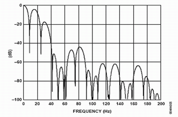 Σ-Δ模數(shù)轉(zhuǎn)換器的內(nèi)置數(shù)字濾波器對于抑制帶外量化噪聲以及其他噪聲源非常有效。噪聲源之一是電力網(wǎng)供電系統(tǒng)產(chǎn)生的頻率。當(dāng)電力網(wǎng)為器件供電時,將產(chǎn)生50 Hz及其倍頻的供電系統(tǒng)頻率(在歐洲),或產(chǎn)生60 Hz及其倍頻的供電系統(tǒng)頻率(在美國)。窄帶模數(shù)轉(zhuǎn)換器主要采用sinc濾波器。AD7793有4個濾波器選項,模數(shù)轉(zhuǎn)換器可以根據(jù)更新速率自動選擇需要使用的濾波器種類。在16.6 Hz的更新速率使用sinc3濾波器。如圖5所示,sinc3濾波器在頻譜內(nèi)存在凹槽。當(dāng)輸出字速率為16.6 Hz時,可以利用這些凹槽同時抑制50 Hz或60 Hz的頻率。
