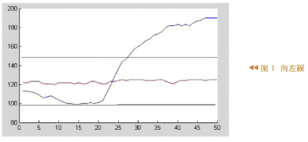 從圖1和圖2中可以看出,兩條黑線(xiàn)之間的數(shù)據(jù)很難斷定是哪個(gè)動(dòng)作產(chǎn)生的,因?yàn)閮蓚€(gè)動(dòng)作都可能產(chǎn)生這樣的值。所以,利用黑線(xiàn)之外的數(shù)據(jù)來(lái)判定是向右還是向左搖。因?yàn)閷?duì)于這兩個(gè)動(dòng)作,黑線(xiàn)之外的數(shù)據(jù)有明顯的差異,數(shù)據(jù)相差很多。對(duì)于圖1這些數(shù)據(jù)大于150,圖2中這些數(shù)據(jù)小于90。因此這些數(shù)據(jù)至少相差60,可以很容易地將向左、向右的兩個(gè)動(dòng)作區(qū)分開(kāi)。
