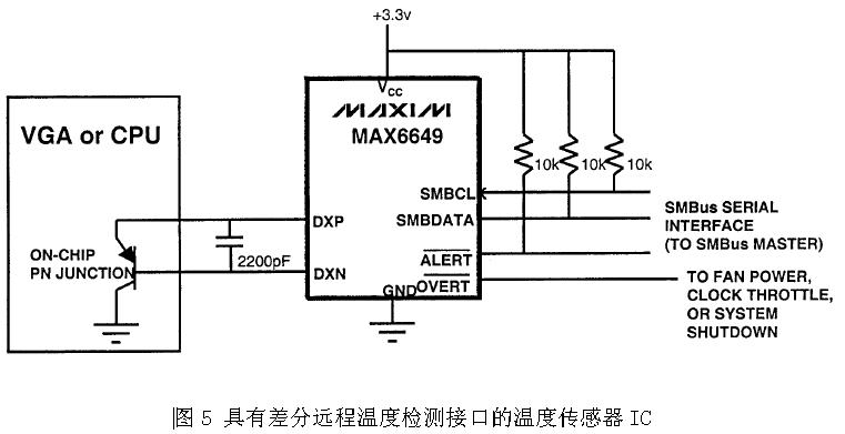 圖5為筆記本電腦普遍使用的一種溫度控制方案。溫度傳感器IC通過SMBus接口連接到筆記本電腦的嵌入式微控制器,由于溫度傳感器IC與嵌入式微控制器之間為數(shù)字接口,因此溫度傳感器IC在位置上可以遠離嵌入式微控制器而不會有噪聲干擾問題。MAX6649同時內(nèi)置一個本地溫度傳感器和用于連接遠端二極管的差分接口。MAX6649的IDH=100uA,IDL=10uA,高精度、小電流的電流源可減小因雜散電阻所產(chǎn)生的測量誤差。差分輸入有助于降低噪聲干擾。圖5所示電路,溫度傳感器IC只負(fù)責(zé)溫度檢測,風(fēng)扇轉(zhuǎn)速控制由嵌入式微控制器完成,由軟件實現(xiàn)。為了避免軟件控制的死機問題,MAX6649還集成了保護功能,當(dāng)溫度到達第一個高溫臨界點時,MAX6649 ALERT可發(fā)出中斷請求,要求嵌入式微控制器進行相應(yīng)的處理,例如對處理器進行降頻;如果上述對策仍無法有效抑制溫度的上升,當(dāng)溫度達到第二高溫臨界點時,MAX6649 OVERT可以用來控制系統(tǒng)的第二個風(fēng)扇或?qū)ο到y(tǒng)進行強制關(guān)機。圖5具有低成本、高精度、使用彈性大等優(yōu)點,但在軟件的設(shè)計上需花費較多的功夫。