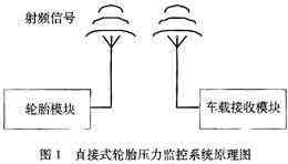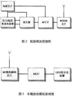 該系統(tǒng)的工作原理如下,把輪胎模塊裝置在輪胎內(nèi),壓力和溫度傳感器檢測輪胎內(nèi)部當(dāng)前的應(yīng)力和溫度信息,獲得的模擬信號經(jīng)過A/D變換器轉(zhuǎn)換成數(shù)字信號,然后通過射頻發(fā)射器發(fā)送出去。車載接收模塊裝置在駕駛室內(nèi),射頻接收器接收來自輪胎模塊的應(yīng)力和溫度信息,當(dāng)輪胎壓力過高或者過低時,通過顯示和報警裝置發(fā)出報警信息。