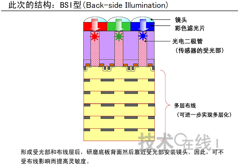 在BSI型CMOS傳感器中,可通過采用傳感器上面沒有布線層的結(jié)構(gòu)來提高采光率。研磨形成傳感器的硅底板,然后將鏡頭靠近傳感器安裝。此項(xiàng)工序采用了晶圓薄化和接合等大量面向MEMS使用的工藝技術(shù)。由于沒有妨礙光線入射的布線層,因此可提高靈敏度。東芝表示,若是已宣布量產(chǎn)的1.4μm產(chǎn)品,則可將靈敏度提高約40%。另外,該元件的光學(xué)格式為1/2.3英寸,幀速率為60幀/秒(支持1080p以及720p)。