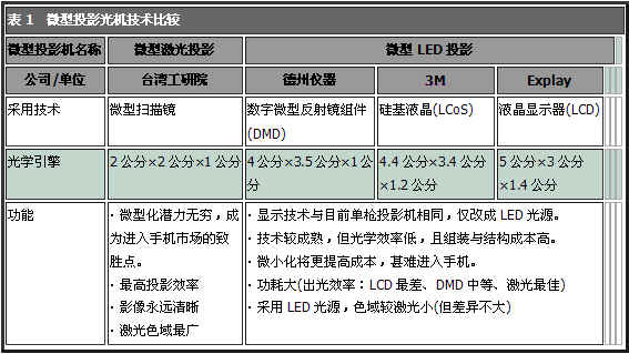 由于便攜式裝置內(nèi)建微型投影機(jī)風(fēng)潮興起,市場對于微型投影機(jī)的尺寸要求更加嚴(yán)苛。有業(yè)內(nèi)人士表示,相比發(fā)光二極管(LED)光源微型投影技術(shù)(表1),激光微型投影具有無限焦距、光機(jī)體積小、色彩飽和度高、低耗能等特性,后勢深具潛力。