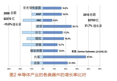 Gartner公司調查總監(jiān)Stephan Ohr從宏觀上分析了MEMS的增長態(tài)勢。Gartner把MEMS分為光學和非光學兩大類。光學MEMS如TI公司的DLP(數字投影芯片)。非光學MEMS傳感器年增長率16.2%(圖2),2010年市場容量會突破30億美元,有望達到31億美元;2009年為28億美元。其中,汽車應用仍然保持非光學傳感器的第一位,占2009年總應用中的60%以上;但是數據處理和通信應用增長最快,數據處理包括硬盤的G-Force(重力)傳感器,通信中包括手機的可旋轉(rational)的傳感和基于位置的服務。