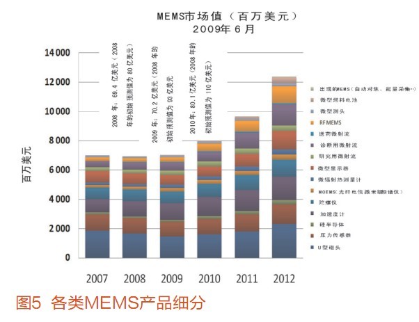 Yolo給出了MEMS的新興和衰落圖(圖7),以及2009-2015年間新興百萬美元價值MEMS預測(圖9)。
