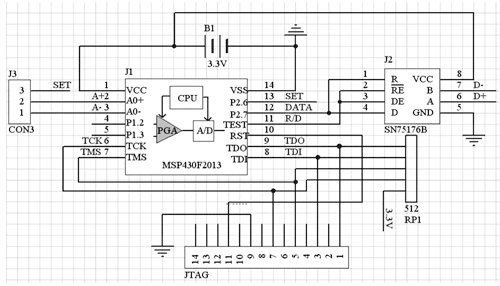 本文介紹的單片傳感信號(hào)接口設(shè)計(jì)采用了德州儀器公司新近推出的一款多功能的微控制器MSP430F2013,它內(nèi)部集成了16位的Σ-ΔADC。2kb的程序空間和128b的數(shù)據(jù)存儲(chǔ)空間,可以完成數(shù)據(jù)的智能采集,并采用差分傳輸方式進(jìn)行數(shù)據(jù)的傳輸。數(shù)據(jù)按幀進(jìn)行傳輸,傳輸過程中采用CRC檢驗(yàn)進(jìn)行差錯(cuò)控制。