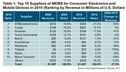 據(jù)IHS iSuppli公司的研究,利用在蘋果iPhone 4和iPad中的設(shè)計訂單,半導(dǎo)體供應(yīng)商TriQuint和意法半導(dǎo)體在全球消費電子與手機微機電系統(tǒng)(MEMS)市場取得突出的增長。