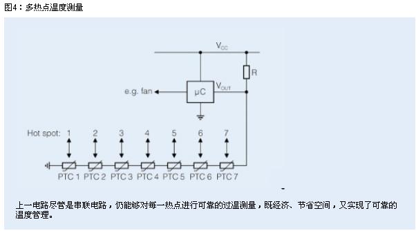 [page]PTC傳感器電阻隨溫度而發(fā)生的陡峭而迅速的變化允許單一簡易電路監(jiān)測多個熱點。舉例來說,如果需要同時監(jiān)測電路板上或設(shè)備中的7個不同熱點,可以選擇圖 4所示電路,在每個待測熱點處放置一個PTC。憑借其陡峭特性,所有PTC可實行串聯(lián),仍能確保對每一處熱點進行可靠監(jiān)測。