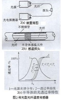 位圖2(a)為半導(dǎo)體吸光型(傳光型)光纖溫度傳感器示意圖。將一根切斷的光導(dǎo)纖維裝在細鋼管內(nèi),光纖兩端面間夾有一塊半導(dǎo)體感溫薄片(如GaAs或InP),這種半導(dǎo)體感溫薄片透射光強隨被測溫度而變化。因此,當(dāng)光纖一端輸入一恒定光強的光時,由于半導(dǎo)體感溫薄片透射能力隨溫度變化,光纖另一端接收元件所接受的光強也隨被測溫度而改變。于是通過測量光探測器輸出的電量,便能遙測到感溫探頭2(b)處的溫度。