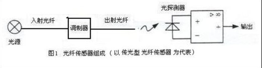 光纖傳感器一般是由光源、接口、光導(dǎo)纖維、光調(diào)制機構(gòu)、光電探測器和信號處理系統(tǒng)等部分組成。來自光源的光線,通過接口進入光纖,然后將檢測的參數(shù)調(diào)制成幅度、相位、色彩或偏振信息,最后利用微處理器進行信息處理。概括光纖傳感器一般由三部分組成,除光纖之外,還必須有光源和光探測器兩個重要部件,見圖1所示。