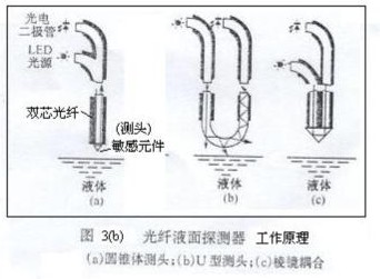 光纖液位傳感器的工作原理如圖3(b)所示。發(fā)光器件射出來的光通過傳輸光纖送到敏感元件,在敏感元件的球面上,有一部分透過,而其余的光被反射回來。當(dāng)敏感元件與液體相接觸時,與空氣接觸相比,球面部的光透射量增大,而反射量減少。因此,由反射光量即可知道敏感元件是否接觸液體。反射光量決定于敏感元件玻璃的折射率和被測定物質(zhì)的折射率。被測物質(zhì)的折射率越大,反射光量越小。來自敏感元件的反射光,通過傳輸光纖由受光器件的光電晶體管進行光電轉(zhuǎn)換后輸出。敏感元件的反射光量的變化,若以空氣的光量為基準,在水中則為-6--7dB,在油中為-25-30dB??蓪Ψ瓷涔饬坎顒e很大的水和油等進行物質(zhì)判別。