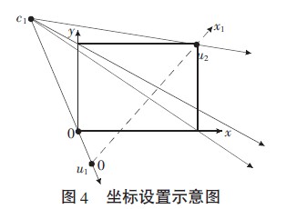 假設(shè)虛擬觸摸屏是如圖4所示的矩形區(qū)域,以左下角為原點(diǎn),建立二維坐標(biāo)平面x、y。左邊攝像頭c1位于虛擬觸摸屏左上角某處,其視角范圍應(yīng)包含整個(gè)矩陣區(qū)域,將c1與矩形的4個(gè)頂點(diǎn)連接構(gòu)成攝像頭拍攝各點(diǎn)的光線方向,以經(jīng)過左下角和右上角頂點(diǎn)的光線方向?yàn)檠?,c1為頂點(diǎn)作一個(gè)等腰三角形,底為虛線所示的(u1,u2)。當(dāng)手指在矩形區(qū)域內(nèi)任意一點(diǎn)觸摸時(shí),其在攝像頭所拍攝的圖像中均表現(xiàn)為虛線上的一點(diǎn),手指在二維虛擬觸摸屏上的移動(dòng)投影到圖像上不會(huì)超過這條虛線(u1,u2)范圍,這是算法關(guān)注的興趣區(qū)域,區(qū)域以外的部分不需要處理。因此以u(píng)1為原點(diǎn)沿著虛線方向建立一維坐標(biāo)x1,右邊攝像頭拍攝圖像中的一維坐標(biāo)x2類似設(shè)立。