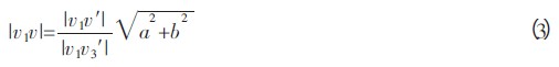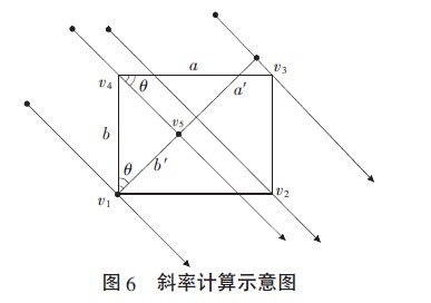 同時(shí)初始設(shè)置時(shí)可以根據(jù)虛擬觸摸屏的長(zhǎng)寬和每個(gè)棋盤格在圖像上的投影確定攝像頭拍攝的每個(gè)棋盤格平行光的斜率。放大圖5 中的棋盤格s,得到圖6。假設(shè)攝像頭c1以斜率k平行拍攝由頂點(diǎn)v1、v2、v3、v4組成的棋盤格s,其邊(v4,v3)的長(zhǎng)度為a,在圖像平面上的投影(v3,v5)的長(zhǎng)度為a′,其邊(v1,v4)的長(zhǎng)度為b,在圖像平面的投影(v1,v5)的長(zhǎng)度為b′。已知虛擬觸摸屏的長(zhǎng)寬,每個(gè)棋盤格的長(zhǎng)a 和寬b 分別為其1/n,a′、b′可從拍攝的圖像上獲得,于是從攝像頭拍攝該棋盤格的平行光的斜率k 可由下式獲得: