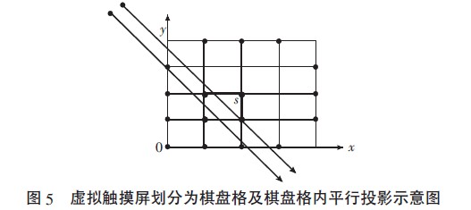 具體實(shí)施中,為準(zhǔn)確識(shí)別手指位置,將虛擬觸摸屏劃分為n×n 的棋盤格,如圖5 所示,由于攝像頭離棋盤格距離較遠(yuǎn),且每個(gè)棋盤格足夠小,于是可以假設(shè)在棋盤格內(nèi),攝像頭拍攝的光線是平行的,以簡(jiǎn)化點(diǎn)位置的轉(zhuǎn)換。