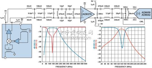 AD8376的電流輸出型電路具有高輸出阻抗,因此其差分輸出需要接150 Ω電阻實(shí)現(xiàn)電壓輸出。另一個(gè)差分濾波器放置在AD8376和ADC之間,用于衰減二階和三階諧波失真成分,因此該150 Ω負(fù)載可以被分成兩部分。首先將300 Ω電阻安裝于AD8376的輸出端。另一個(gè)300 Ω電阻由兩個(gè)165 Ω電阻和ADC的3 kΩ輸入阻抗構(gòu)成。兩個(gè)165 Ω電阻同時(shí)為ADC輸入提供直流共模電壓。LC濾波器的輸入和輸出阻抗均為300 Ω。對(duì)于高中頻應(yīng)用,信號(hào)源和負(fù)載的阻抗的完美匹配是非常重要的。完整接口如圖4所示。