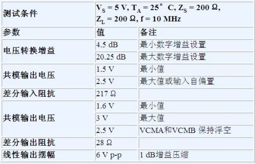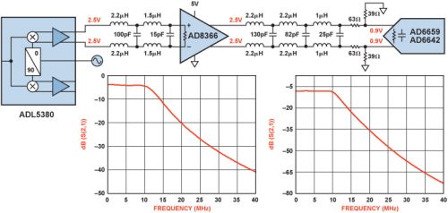 與具有217 Ω差分輸入阻抗的AD8366接口時(shí),ADL5380具有5.9 dB電壓增益和–0.5 dB功率增益[5.9 dB – 10log (217/50)]。為獲得最佳性能,將ADL5380 ADJ引腳連接至VS,使ADL5380與AD8366間的共模電壓設(shè)置為2.5 V。在ADL5380與AD8366間放置具有0.5 dB插入損耗的差分四階巴特沃茲低通濾波器,以便抑制噪聲和高頻干擾成分。雖然濾波器會(huì)輸入和輸出阻抗并不匹配,但在基帶頻率下這些不匹配是可以忽略的。